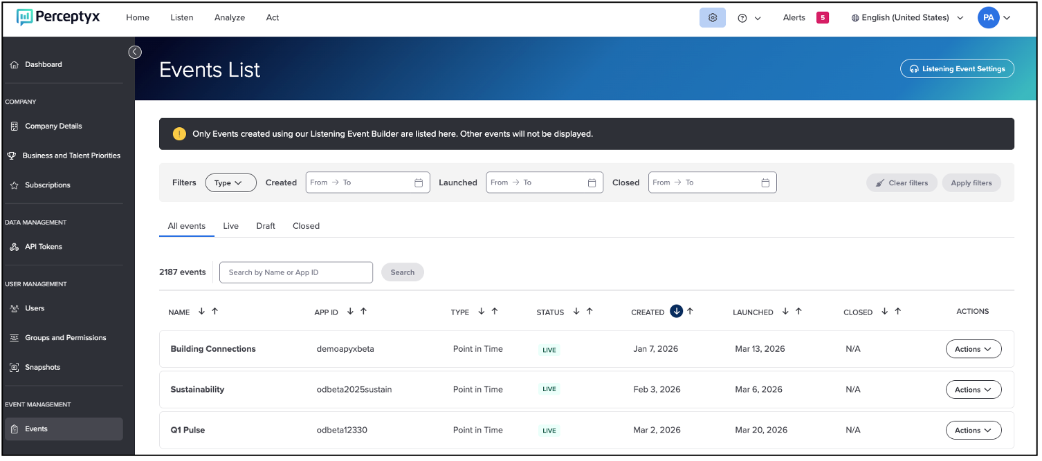 The new Event Management area in the Admin Portal is designed to support organization-wide oversight of listening events for Platform Administrators. It provides a centralized place to audit Perceptyx-led and self-led events and validate access without navigating into each event individually.