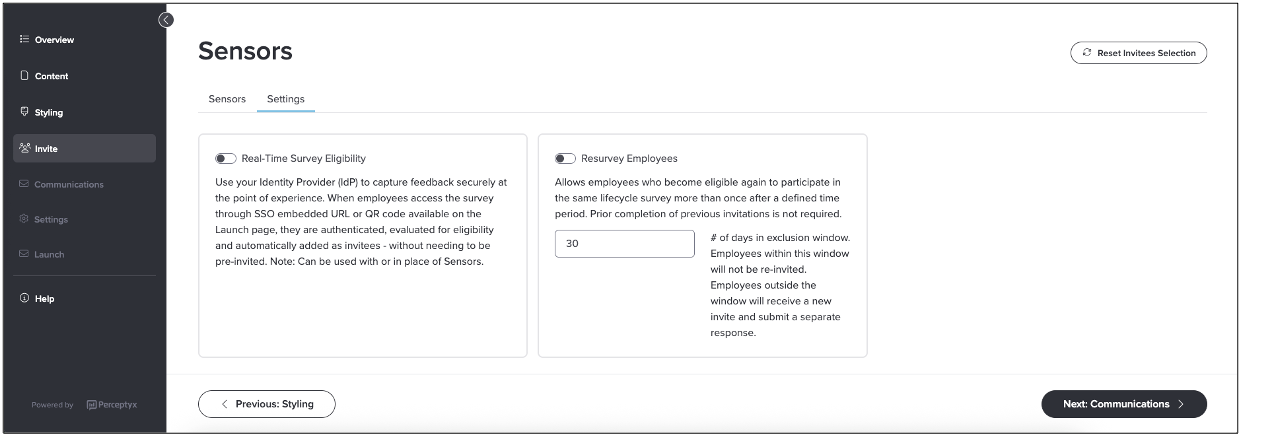 When Resurvey Employees is enabled, admins configure an exclusion window that determines how soon an employee can be invited again.