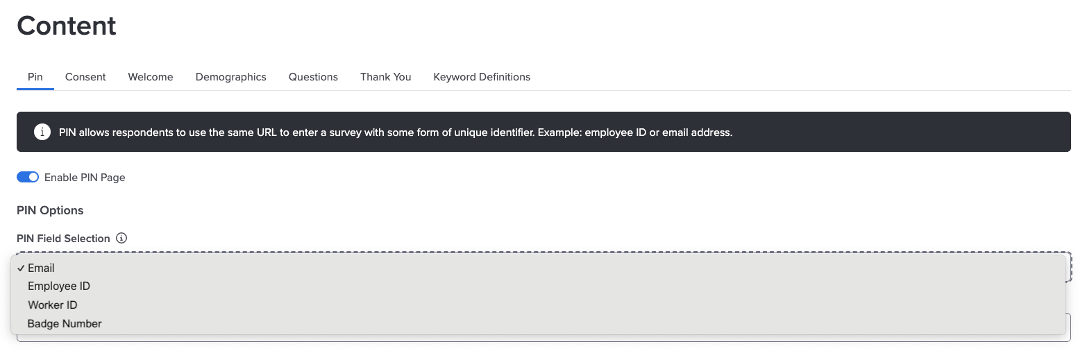 Organizations can now define custom PIN fields using any unique demographic value from their employee data file, making it easier for more employees to participate in listening events. In addition to email address and employee ID, you can use familiar identifiers such as worker ID or badge number to authenticate respondents.